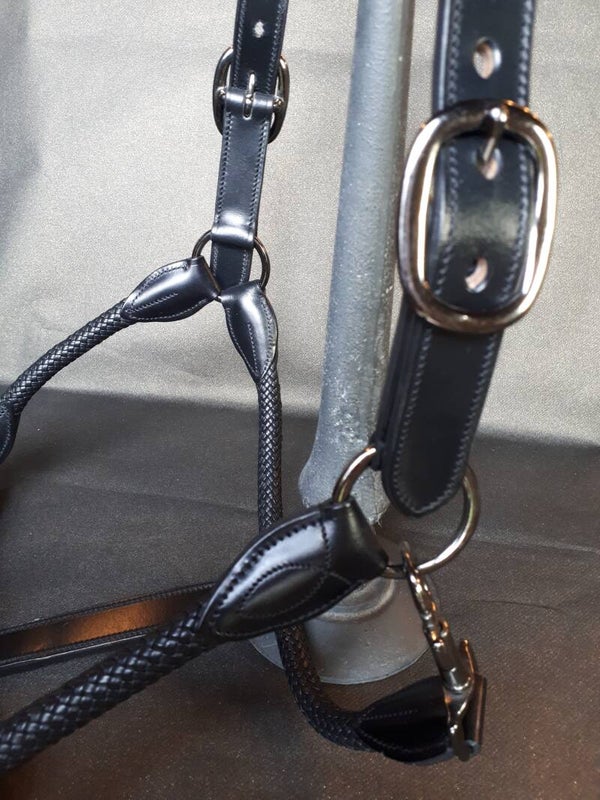 Luxe Engels lederen halster met rond vlechtwerk aan neusriem, keelriem en bakstukken.