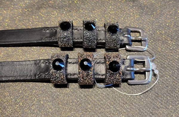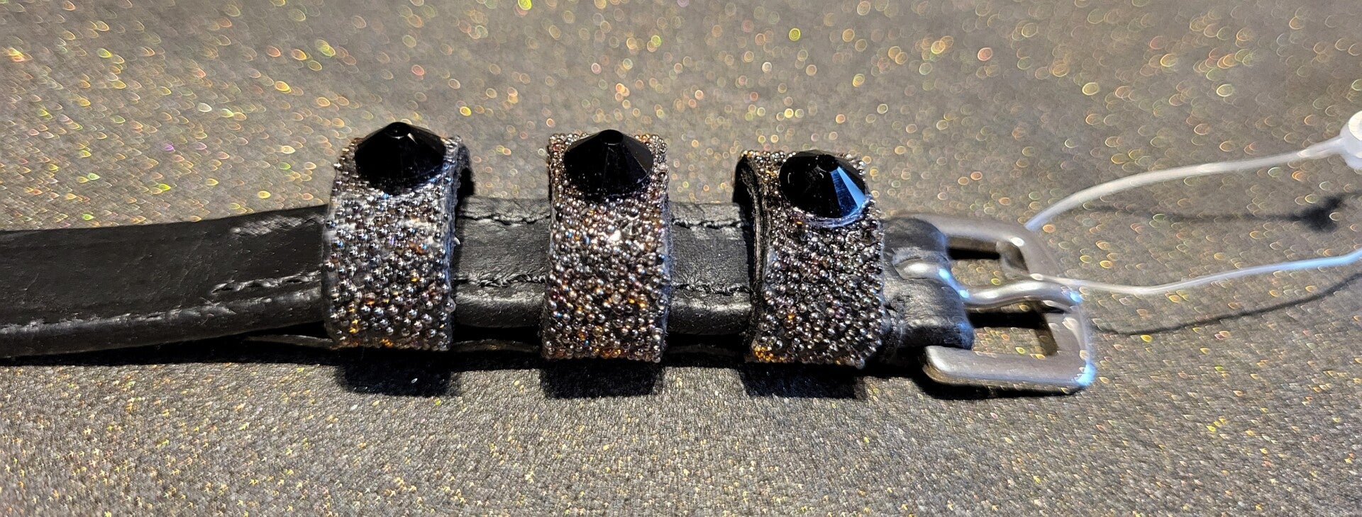 Soepele gladlederen luxe spooriempjes met 3 sluitings passanten in Crystal Fabric Black/Silver.
