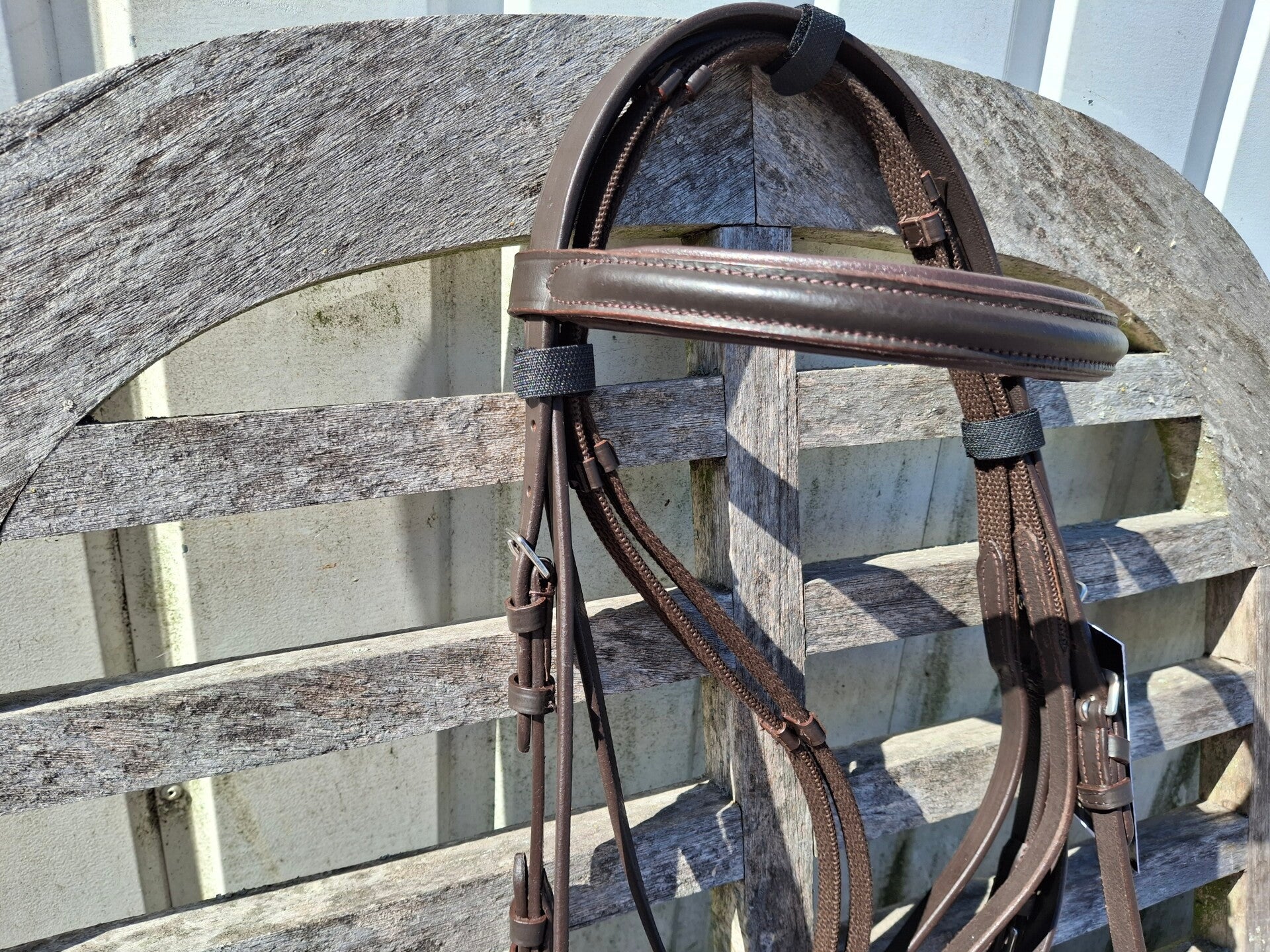 Eenvoudige doorstikte en met zacht leder onderlegde frontriem en neusriem.